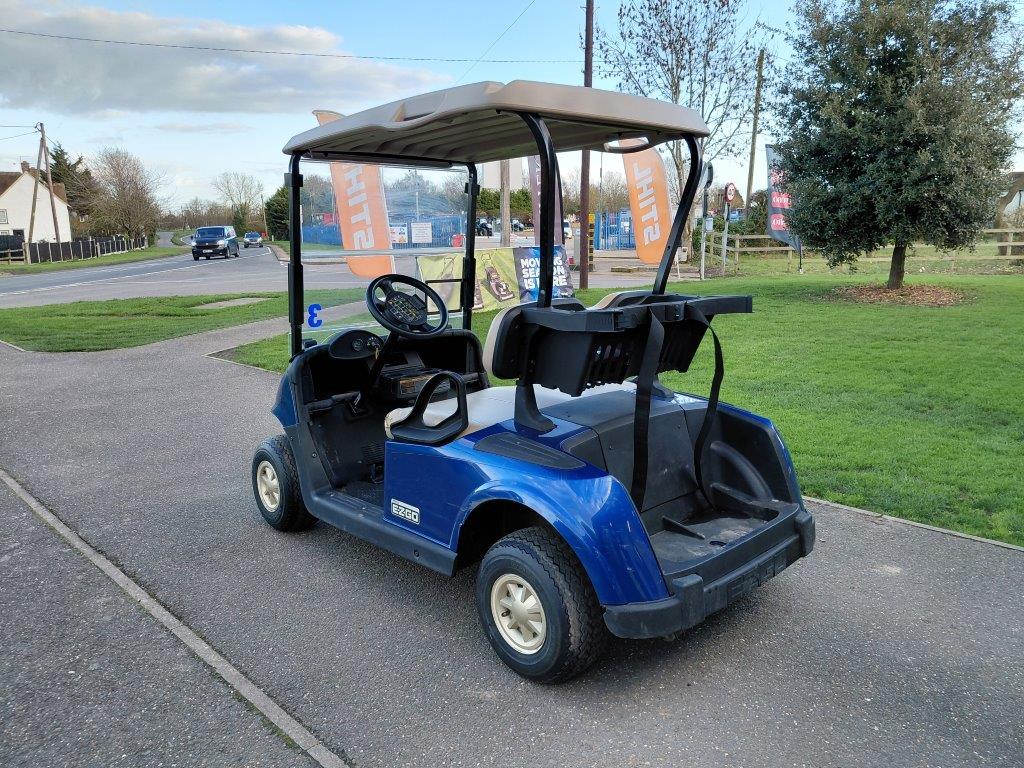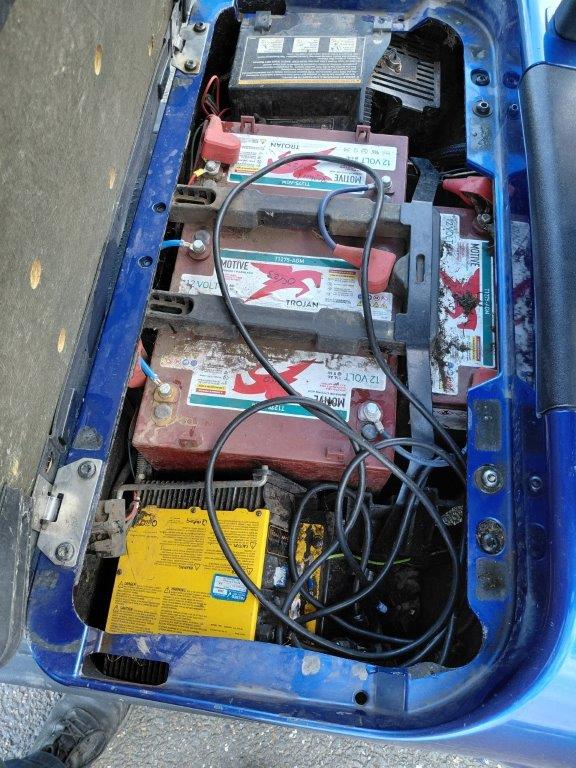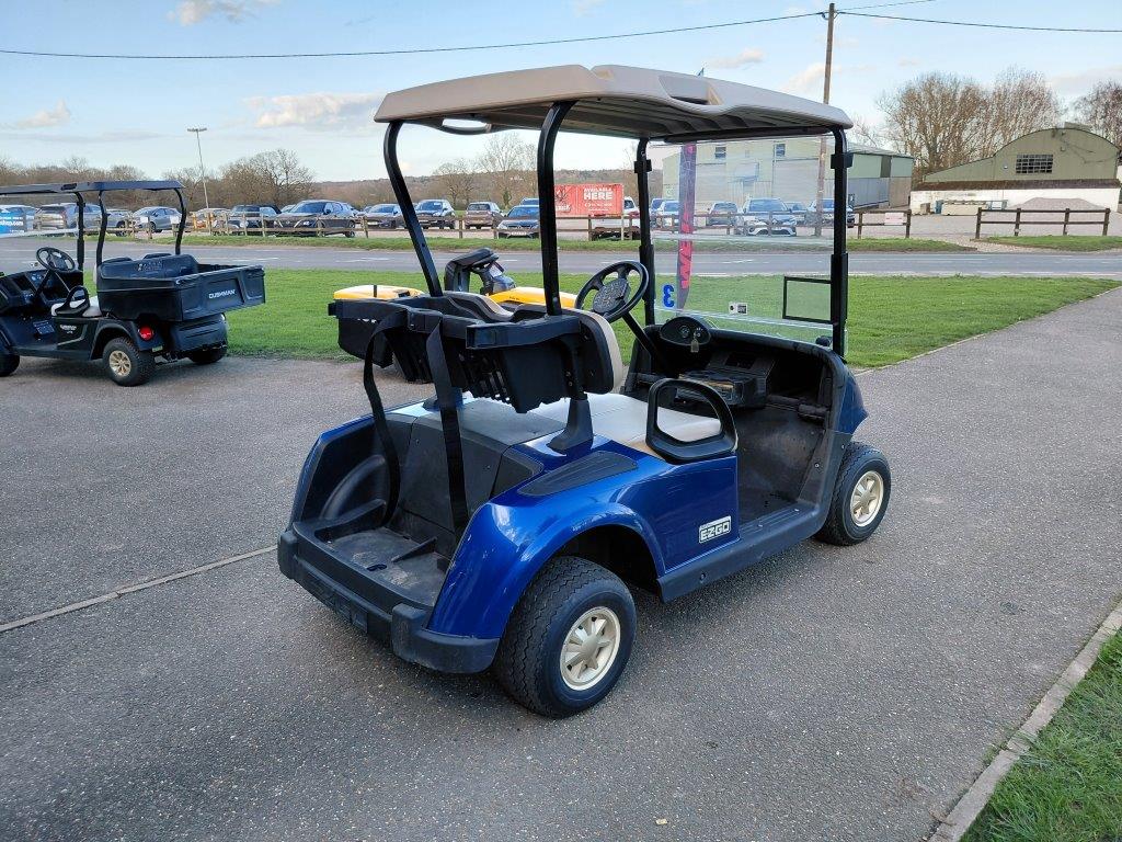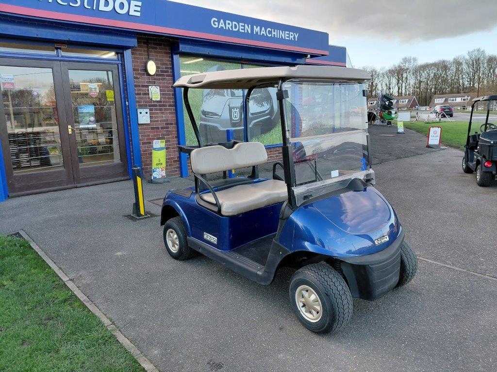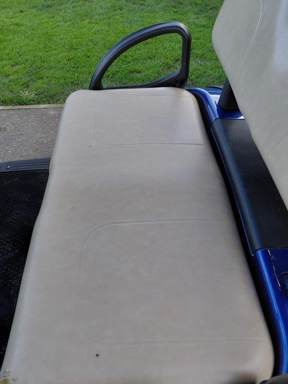 ELECTRIC BLUE 48 VOLT, ON BOARD CHARGER, BATTERY FILLING KIT, FOLD DOWN WINDSHIELD, STONE BEIGE SUNTOP AND SEATS, TWIN BAG CARRIER, SWEATER BASKET, BATTERIES REPLACED 2023