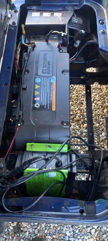 PATRIOT BLUE 48 VOLT DC LITHIUM ION, ON BOARD CHARGER, FOLD DOWN WINDSHIELD, STONE BEIGE SUNTOP STONE BEIGE SEATS, TWIN BAG CARRIER, SWEATER BASKET.